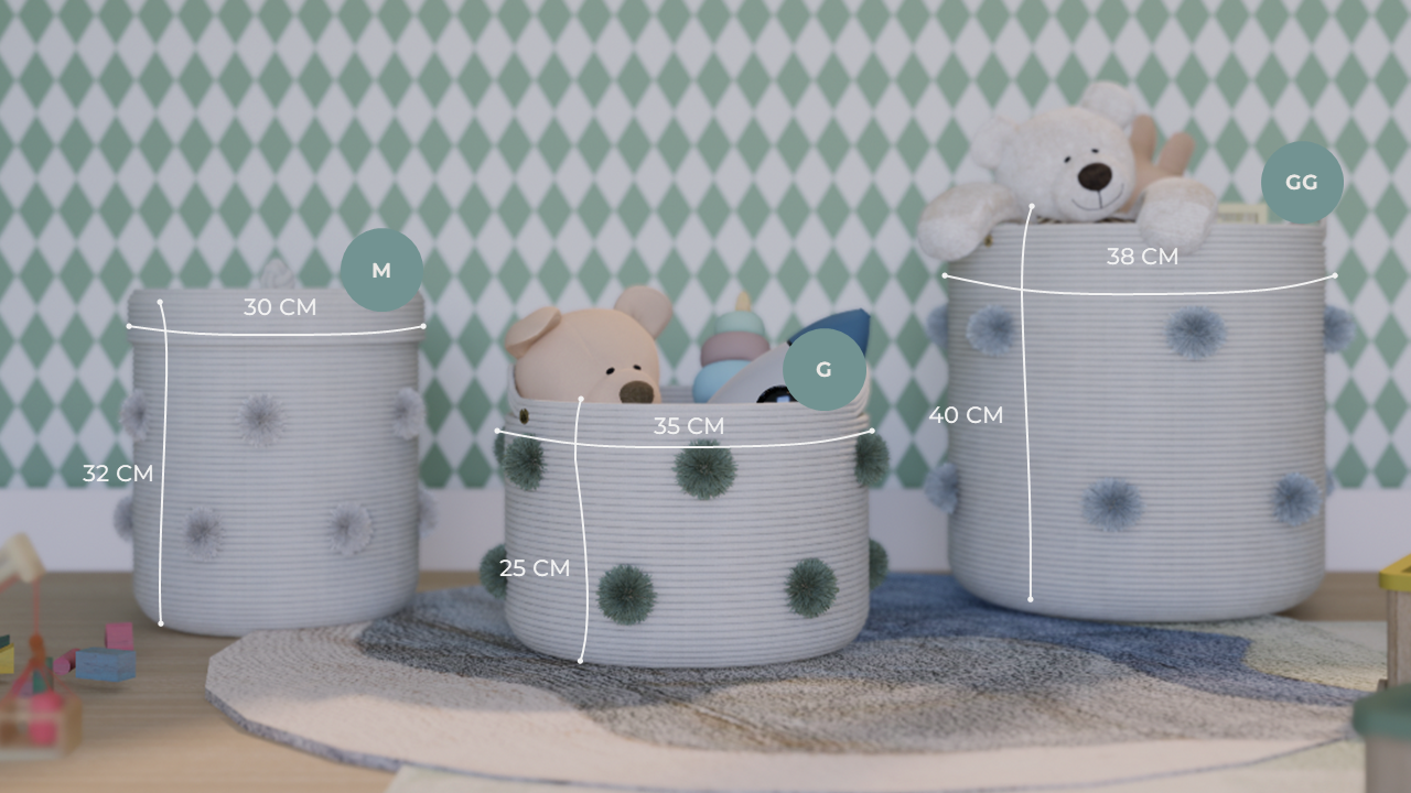 Nessa opção, o cesto pompom monocromático, é confeccionado à mão em corda trançada (100% algodão) de alta qualidade e acabamento refinado. Um cesto extremamente robusto e firme para suportar toda a diversão dos pequenos na hora de organizar brinquedos e outros itens.